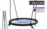 Качели-гнездо Midzumi выполнены из металлической рамы диаметром 100 сантиметров, с дополнительной защитной оплеткой ее бортиков, обтянутых прочным синтетическим канатом толщиной 10 мм выдерживающим нагрузку 100 кг. Плетеное синтетическое сидение качелей удобное и практичное, не собирает грязь и воду, при сильных загрязнениях его можно протереть.